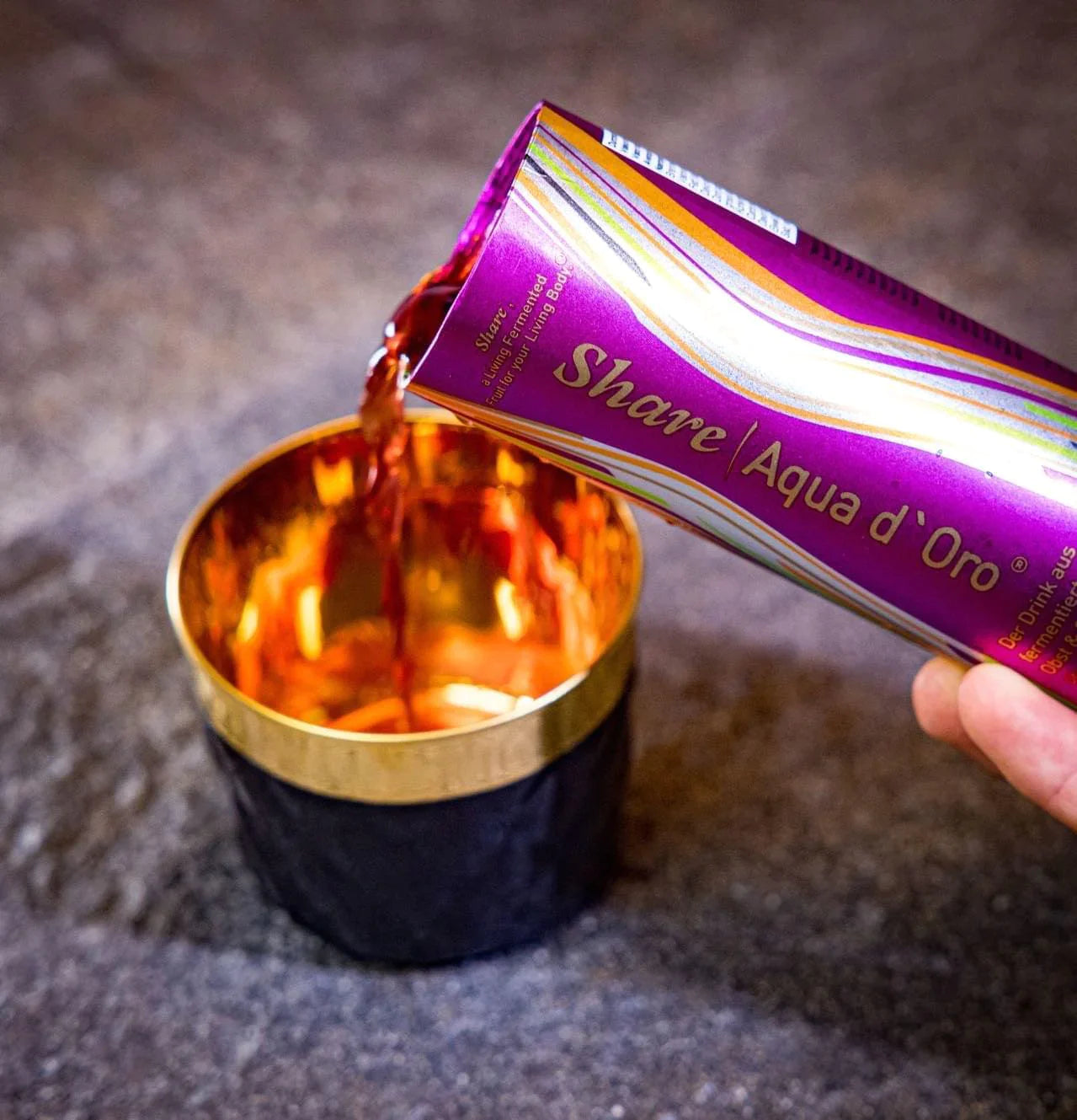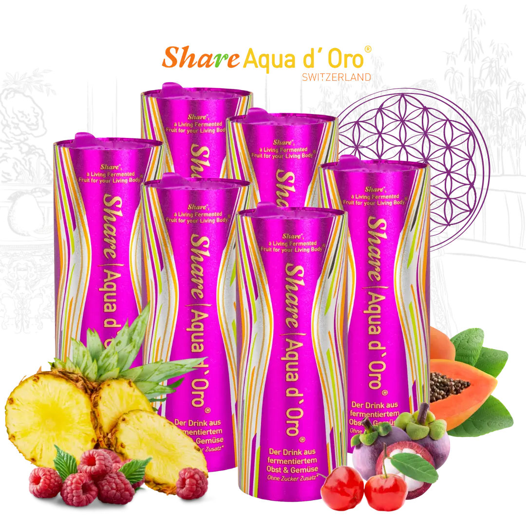 ShareAqua d'Oro® je svetovna novost! Prva pijača iz soka fermentiranega sadja in zelenjave. »Zlata voda« vsebuje dragocene sestavine, ki lahko izboljšajo splošno počutje, kot so nam povedali številni uporabniki.